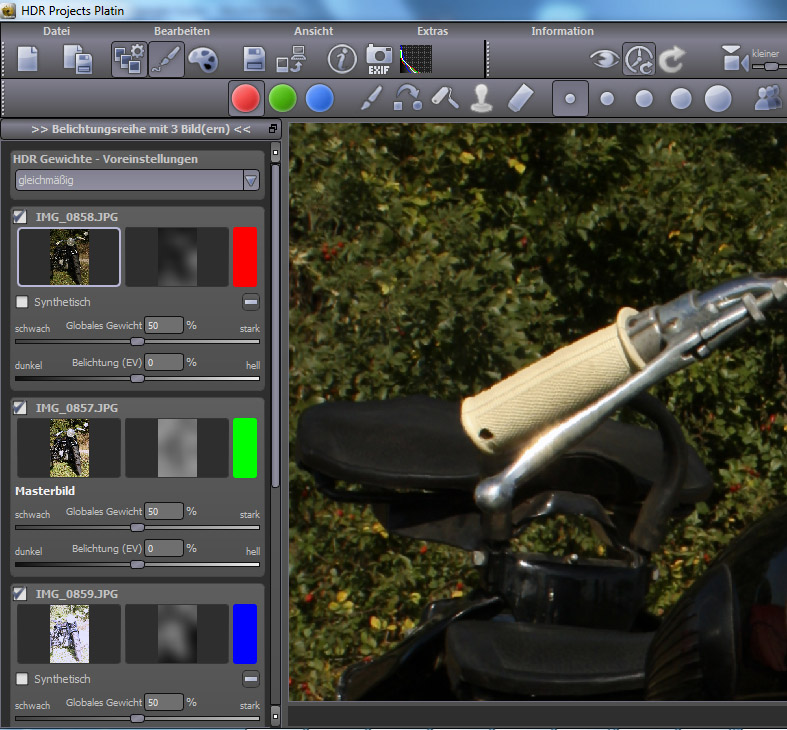 Wir gehen in den Bearbeitungsmodus "Gewichte Bearbeiten", das Symbol mit dem Pinsel in der Werkzeugleiste. (Gewichtung der unterschiedlich belichteten Motive als Ganzes oder selektiert im Detail, die letztendlich in das HDR Bild verrechnet wird.)